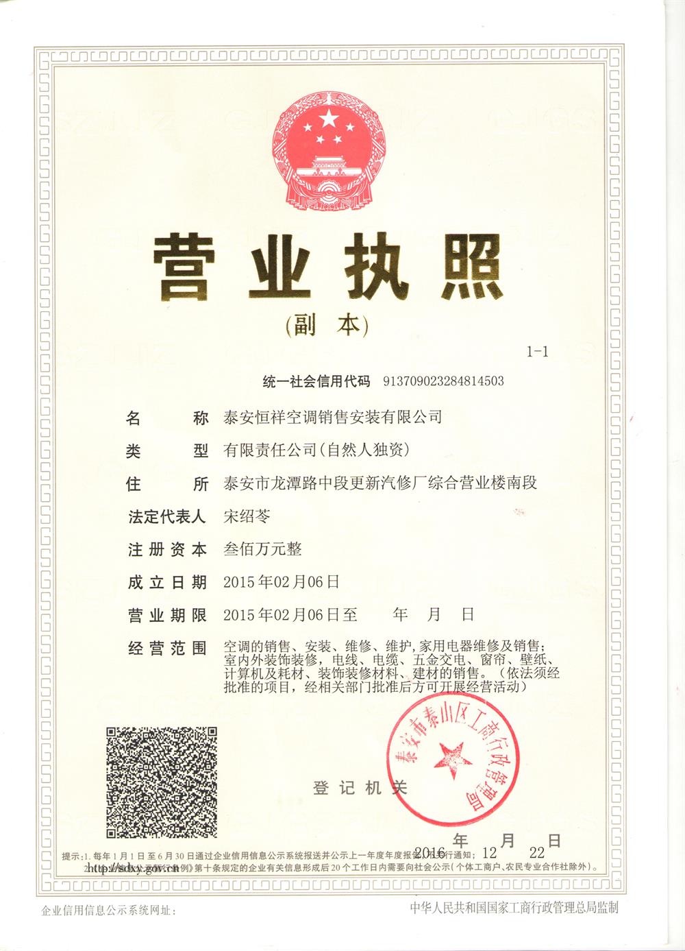 泰安恒祥空調(diào)銷(xiāo)售安裝有限公司,位于山東省泰安市岱岳區(qū)靈山大街與迎勝路交叉口向西200米路北王府花園A區(qū)12號(hào)商業(yè)樓103店鋪,其前身泰安恒祥電器經(jīng)營(yíng)部,是泰城格力空調(diào)專(zhuān)賣(mài)店,也是我們市目前經(jīng)營(yíng)格力系列產(chǎn)品的代理商。因業(yè)務(wù)發(fā)展需求,2012年3月26日更名為泰安恒祥空調(diào)銷(xiāo)售安裝有限公司,力爭(zhēng)打造規(guī)范化空調(diào)公司,同時(shí)響應(yīng)總部要求重裝為以格力家用空調(diào)、小家電系列、空氣能熱水器、晶弘冰箱、凈水機(jī)系列及家用、商用中央空調(diào)一體,并設(shè)有所有格力產(chǎn)品的實(shí)機(jī)體驗(yàn)區(qū)。